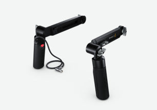 Manija para producciones profesionales con visor OLED, sistema óptico de precisión, micrófono estéreo, botón para iniciar o detener la grabación y controles programables.
