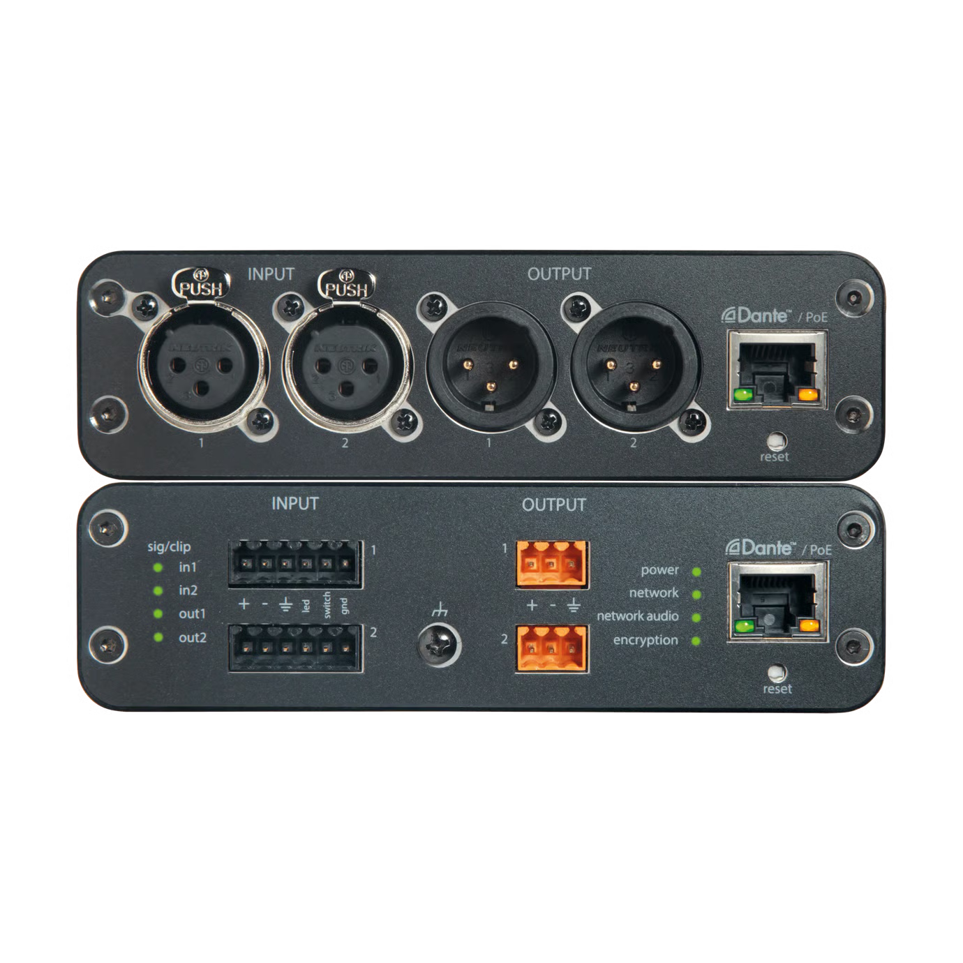 - Convierte hasta 2 señales de audio digital Dante en señales analógicas micro/línea. ANI22BLOCK: conectores de tipo bloque de audio analógico (2 entradas, 2 salidas). ANI22XLR: conectores de XLR de audio analógico (2 entradas, 2 salidas).