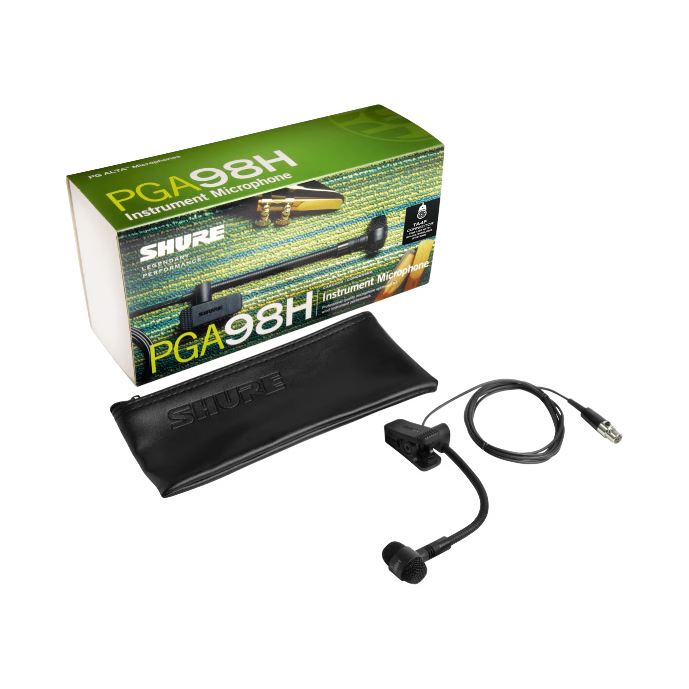 El PGA98H es un micrófono para instrumentos de viento, de calidad profesional y con un diseño discreto y moderno, con rejilla y acabado metálicos de color negro. Cuenta con un cuello de cisne flexible, discreto y robusto, una pinza acoplable al instrumento y un conector TA4F para utilizar con los sistemas inalámbricos. El PGA98H es ideal para actuaciones en directo y grabaciones.