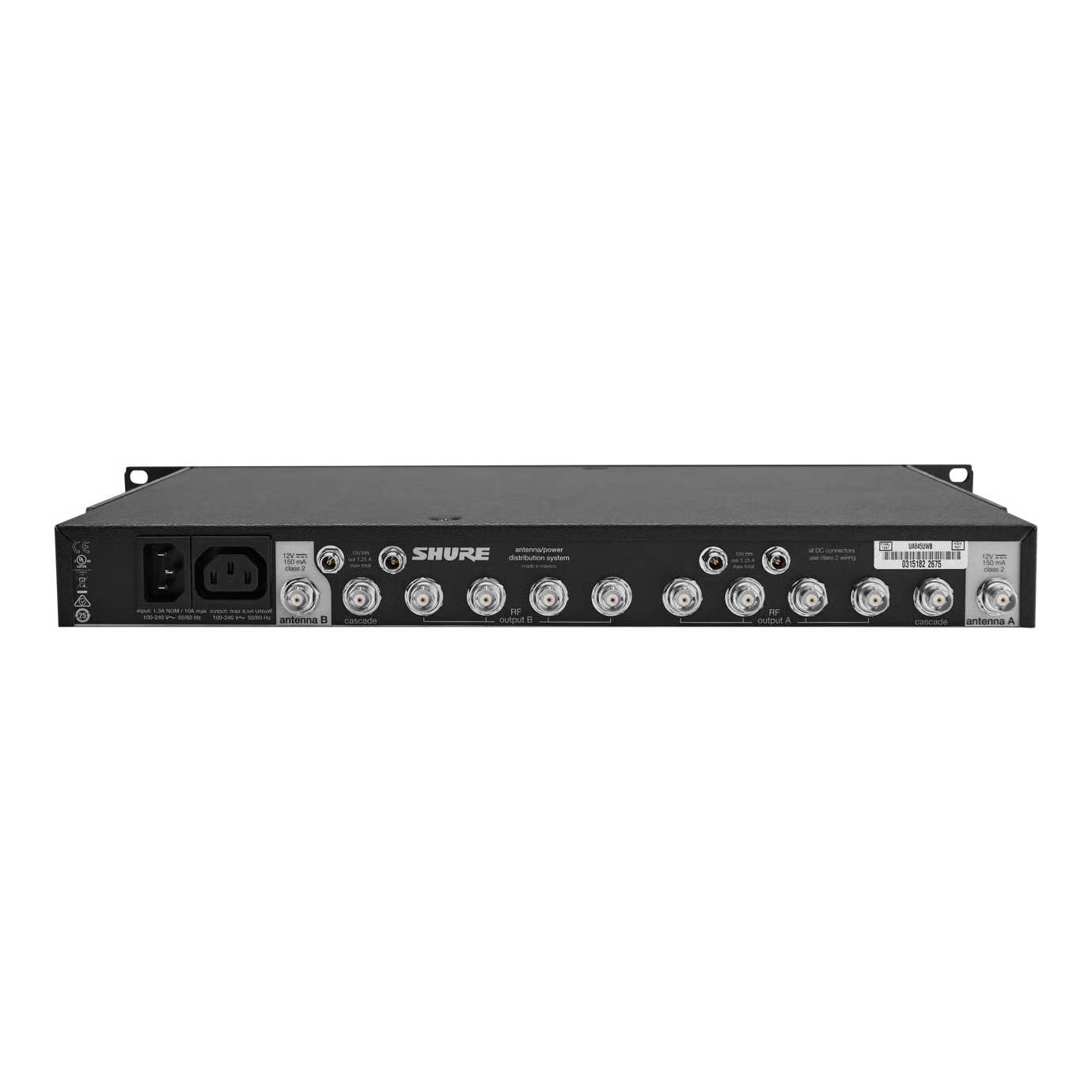 El modelo UA845UWB de Shure es un sistema de amplificación y distribución de antena de VHF y UHF diseñado para ampliar un sistema de microfonía inalámbrica al dividir un par de antenas entre varios receptores UHF-R, ULX-D, BLX4R, SLX4 y BLX4R de Shure. También amplifica las señales de RF para compensar las pérdidas de inserción que resultan al dividir una señal entre varios conectores de salida. Cada UA845UWB permite que hasta 4 receptores utilicen las mismas antenas. Los conectores CASCADE permiten conectar un quinto receptor o una unidad UA845UWB adicional.
