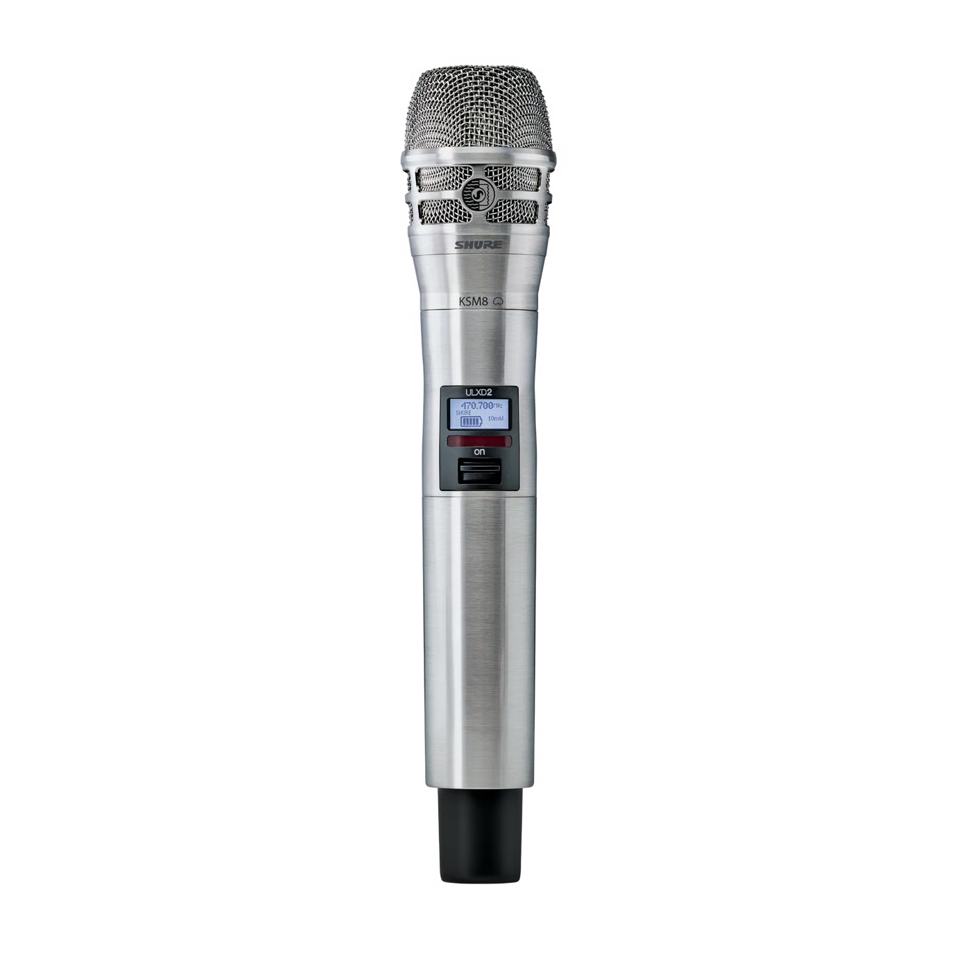 El KSM8 con transmisor de mano ULXD2 incluye el micrófono vocal dinámico cardioide KSM8 Dualdyne, que proporciona control del efecto proximidad y atenuación fuera del eje, además de una captación y reproducción vocales de máxima claridad durante interpretaciones en directo.